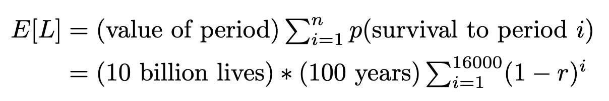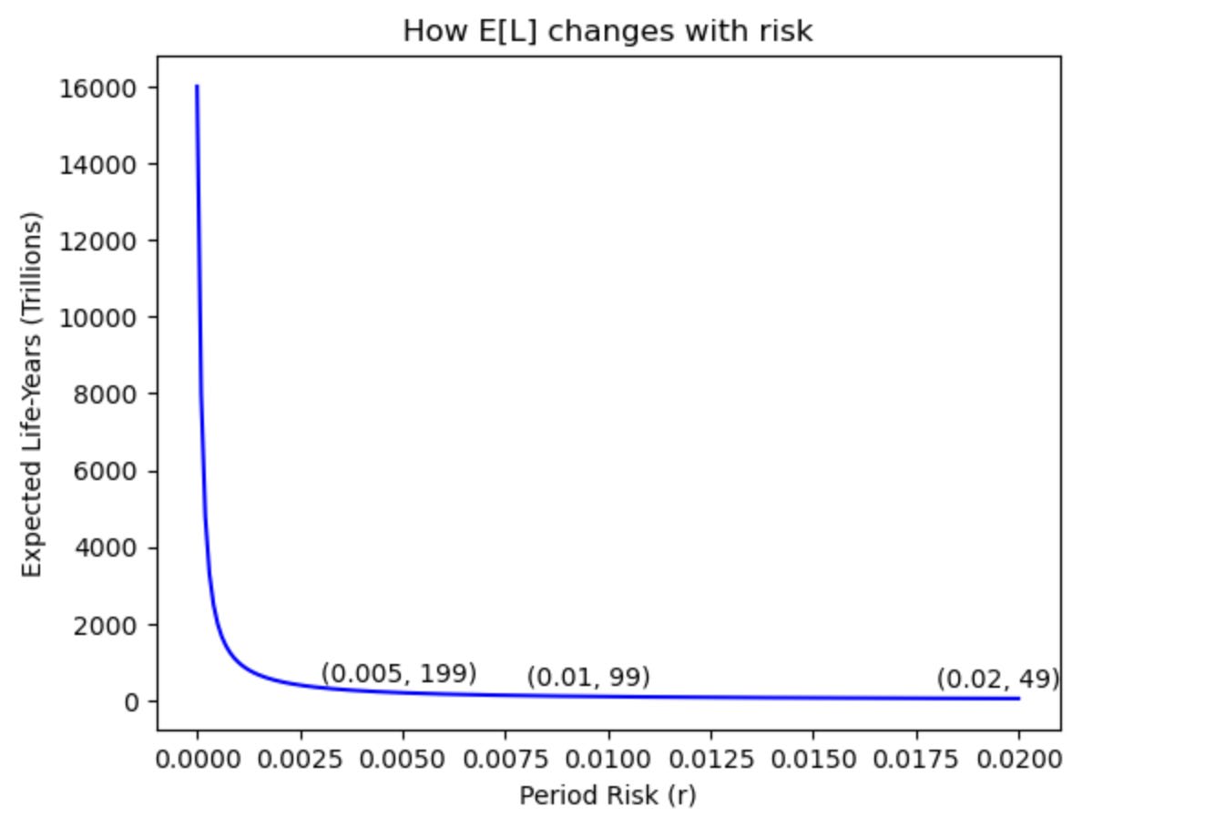 To understand this, let’s start with an equation for the expected life-years E[L] in the future, parameterized by a period existential risk (r), and fill it with respectable values:[3]