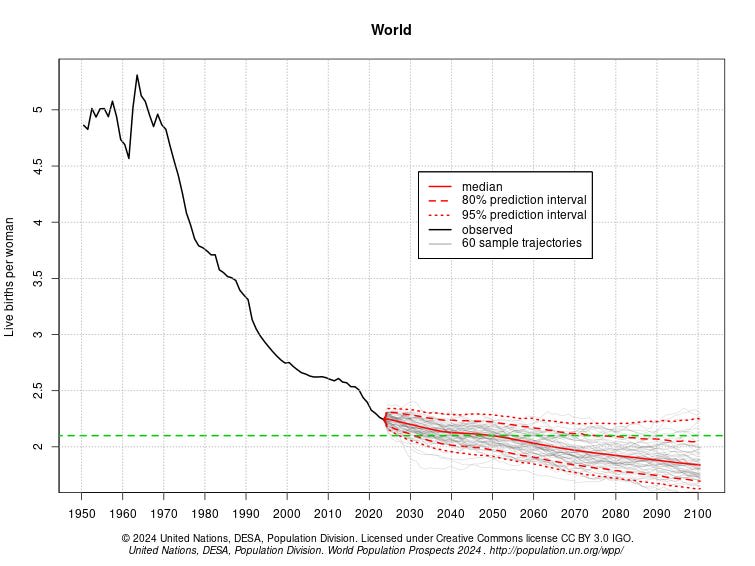 United Nations modeling currently projects that global fertility will fall below replacement rate around 2050 and continue declining from there. The effect is that total population is expected to begin dropping around 2100.