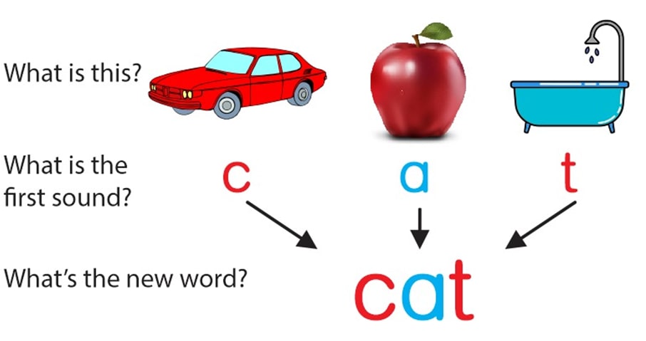 The ALfA program in English. Learners are asked three key questions (left) to build from picture to sound to word. Note that this is easier in Hindi, a phonetic language (each letter makes a single sound, unlike English)
