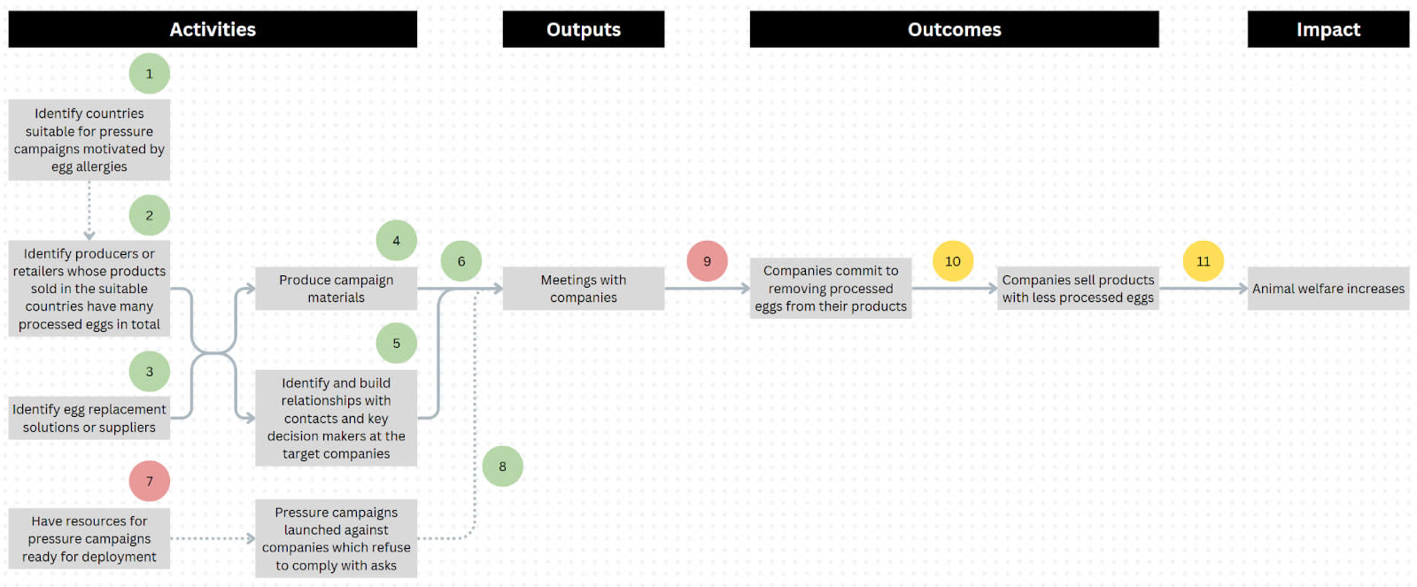 Below is the causal chain of the theory of change. Green is for low uncertainty, yellow for medium uncertainty, and red for high uncertainty. The activities regarding pressure campaigns have dotted arrows coming out of their boxes because they are optional.