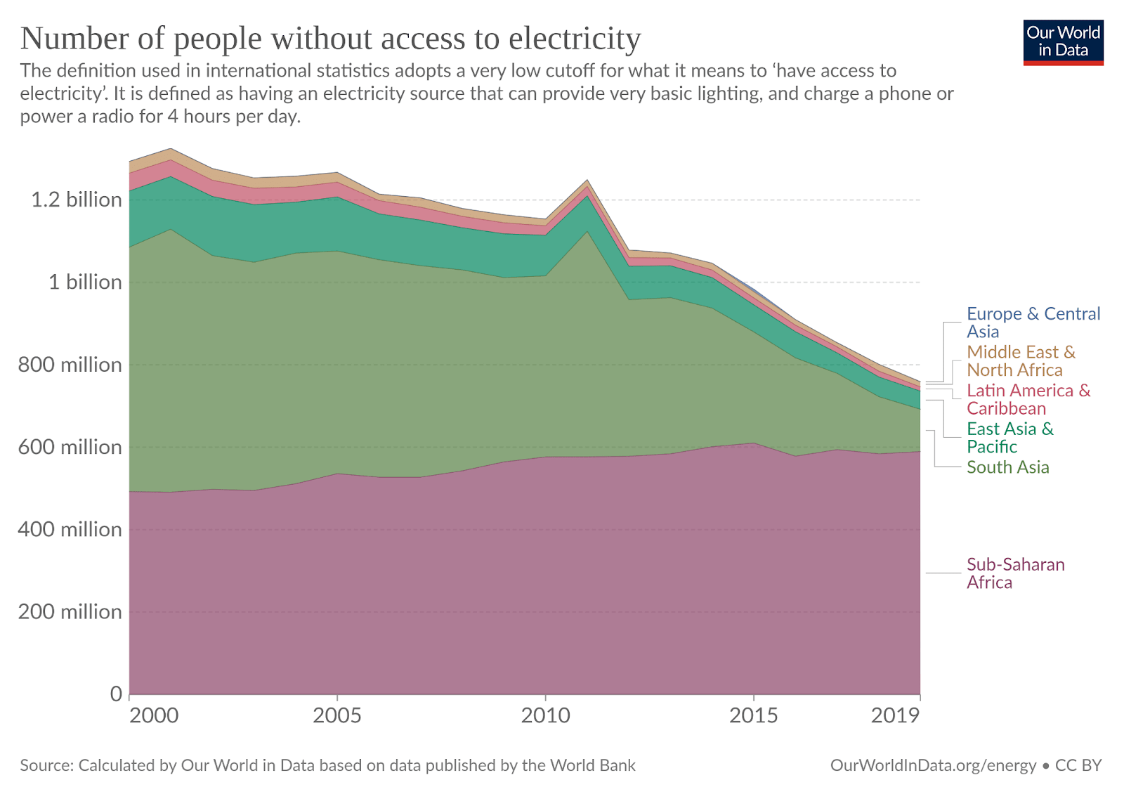 When you see data on people with energy access in the world, they’re based on an astonishingly low standard for “electrification.” The World Bank treats you as electrified if you have access to enough electricity to supply 25 lumens and power a phone for four hours a day. This is referred to as Tier 1 of electrification: extremely dim light, and the power is out more often than it’s on. The bar is on the floor, but even so, the number of people in Sub-Saharan Africa without any electricity climbed until 2016, since which time it’s held about steady.