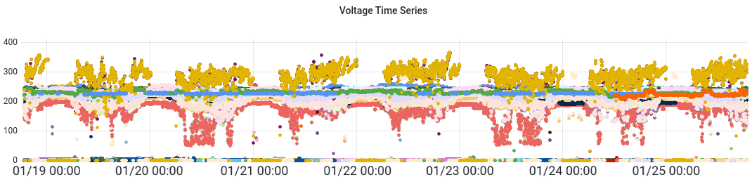 This is voltage data collected at 27 healthcare facilities in the Democratic Republic of Congo, collected by nLine as part of this study (Miles et al, 2023). All these healthcare facilities are electrified, but there’s a lot of variety in what kinds of services each is able to provide. Most require diesel generators as backup for when the power is out, or when the voltage from their main power source is too volatile and they need to power sensitive equipment. One facility runs on diesel generator alone, 24/7, which costs tens of thousands of dollars per year (the Catholic church foots the energy bill at this particular facility).
