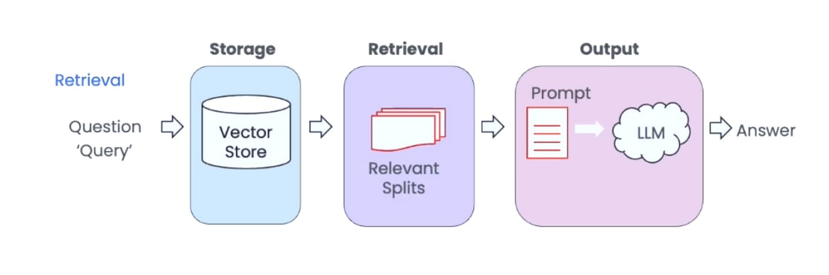 - Storage+Retrieval: We retrieve chunks from the vector database that are semantically similar to the user's question.