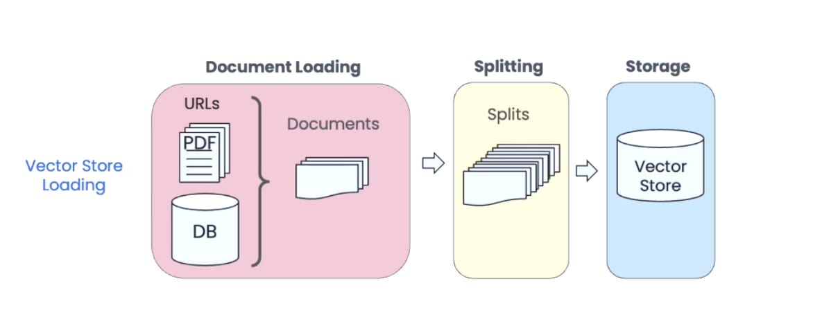 - Splitting: Then the text content of the documents is broken up into fixed-sized chunks.