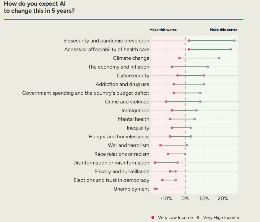 A striking finding is that the area where people expect the greatest positive impact from AI is biosecurity and pandemic prevention(!) (see figure 1 below). I understand that AI applications in biosecurity do exist and are promising, however the idea that the general public believe the net impact of AI on biosecurity is expected to be strongly positive over the next 5 years seems pretty surprising. This is even more surprising as high-income survey respondents expect a more positive impact here, which is counterintuitive if you believe that more educated higher earners might have been more exposed to AI-biorisk arguments.