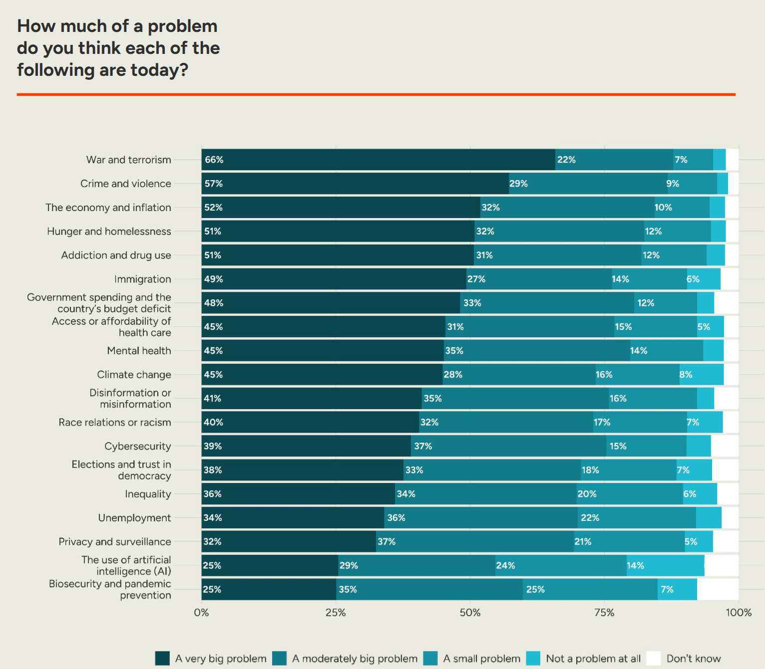 Perhaps relatedly, biosecurity and pandemic prevention was rated as the least a problem today (below everything other than AI itself).