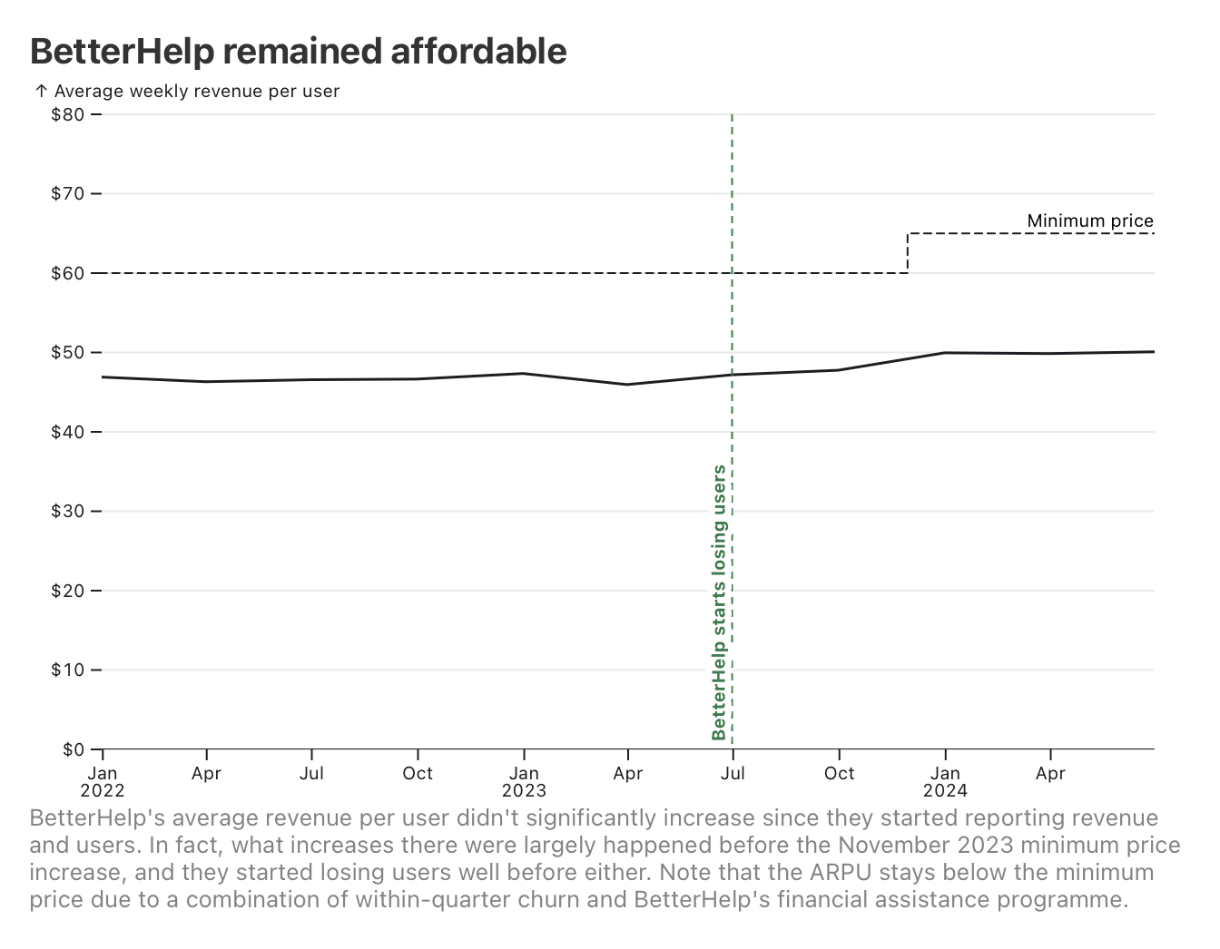 BetterHelp’s ARPU over this period has held steady, and, in fact, seems to have increased before the November 2023 minimum price increase (from US$60 → US$65). (I didn’t find evidence that they’d quietly increased prices on existing users before updating their website, either). Notably, they started losing users before either event.