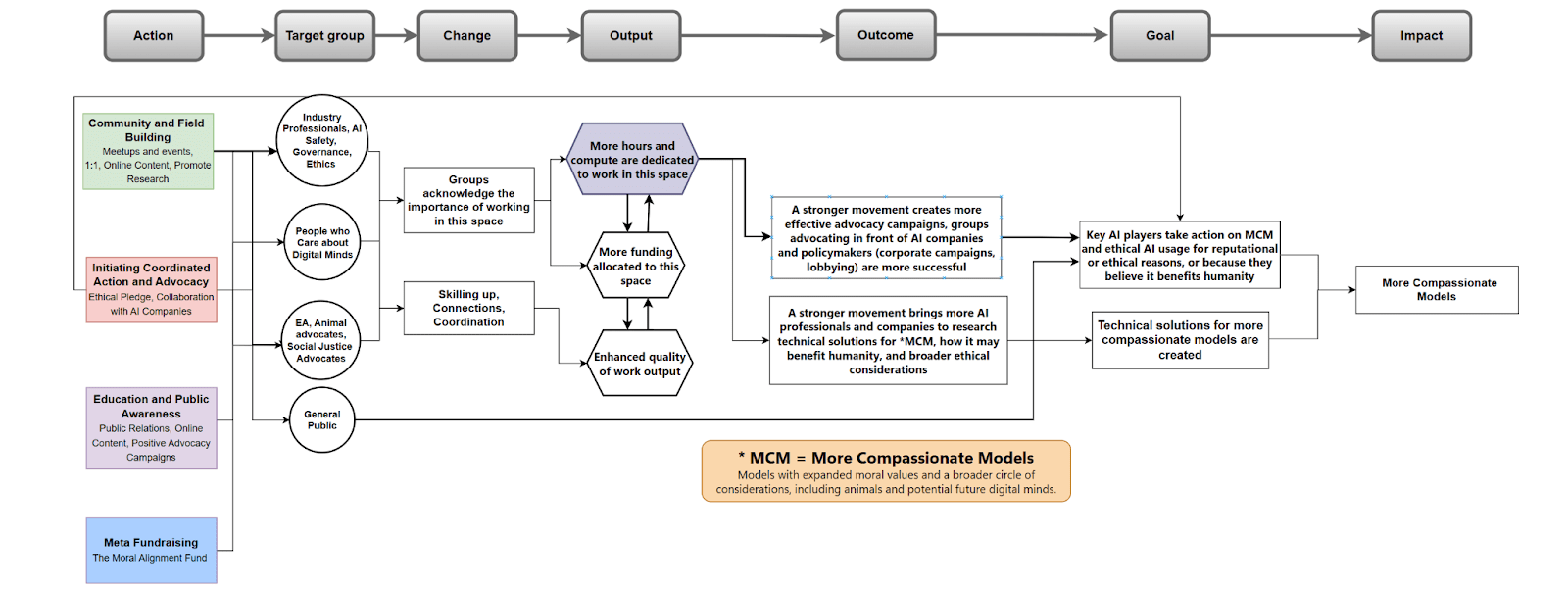 - Our most important target group consists of AI key players who possess ethical views that are much more pro-animals/humans/digital minds than the average person. Many AI professionals, from AI safety to people working in top-tier companies, really care about all sentient beings but haven't fully explored their potential for a positive impact on MA.