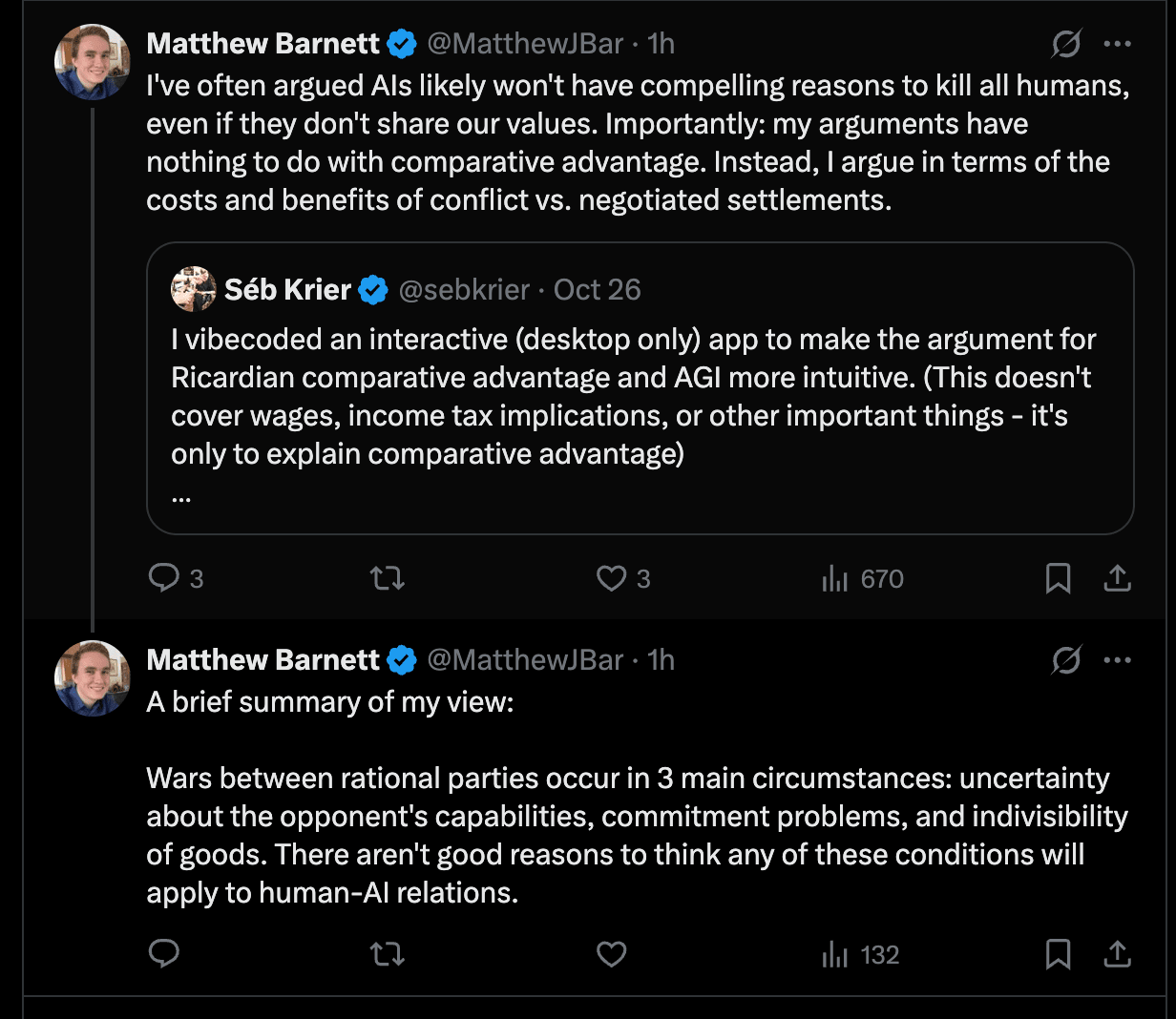 So, to reach the conclusion that an AGI will negotiate, we want these things to hold for AGI/human interactions too.