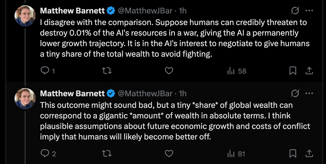 Matthew is clear that he does not think this is guaranteed, but that negotiation is what should occur if we and the AGI are rational.