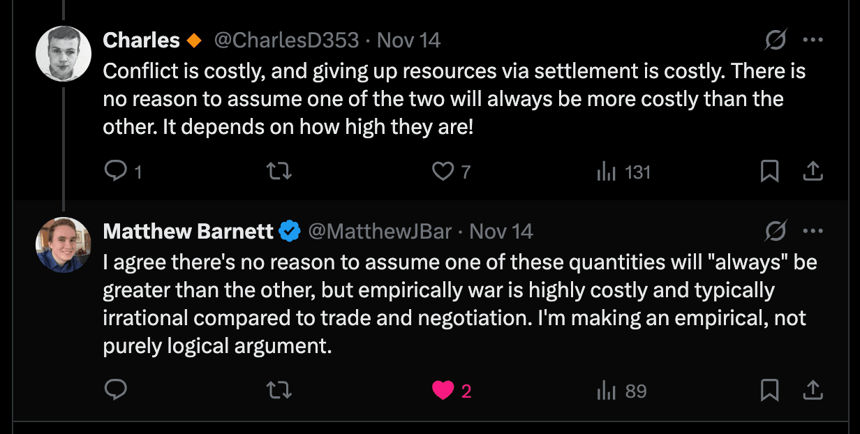 The strongest argument for the case here, I think, is that the AGI can simply demonstrate it’s capabilities to the human side, leaving them with no uncertainty. This may be constrained by difficulty in demonstrating the capabilities without actually causing significant harm, or strategic advantage from hiding those capabilities. At some point the cost of demonstrating it’s capabilities to the AGI may exceed the cost of simply going to war.