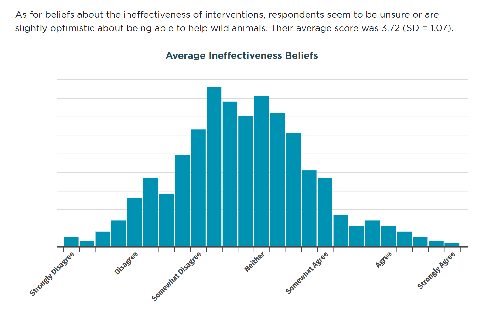 We also asked, more abstractly, about whether people endorse the attitudes that intervening to help wild animals is infeasible (what we call 'intervention ineffectiveness), with these items: