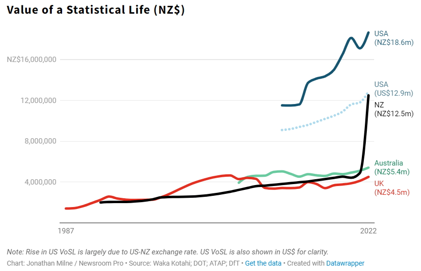 A short post noting that Waka Kotahi, the New Zealand Transport Agency, has recently increased the value that it places on human life to $12.5M NZD ($7.8M USD), a significant increase from the $4.9M used previously.