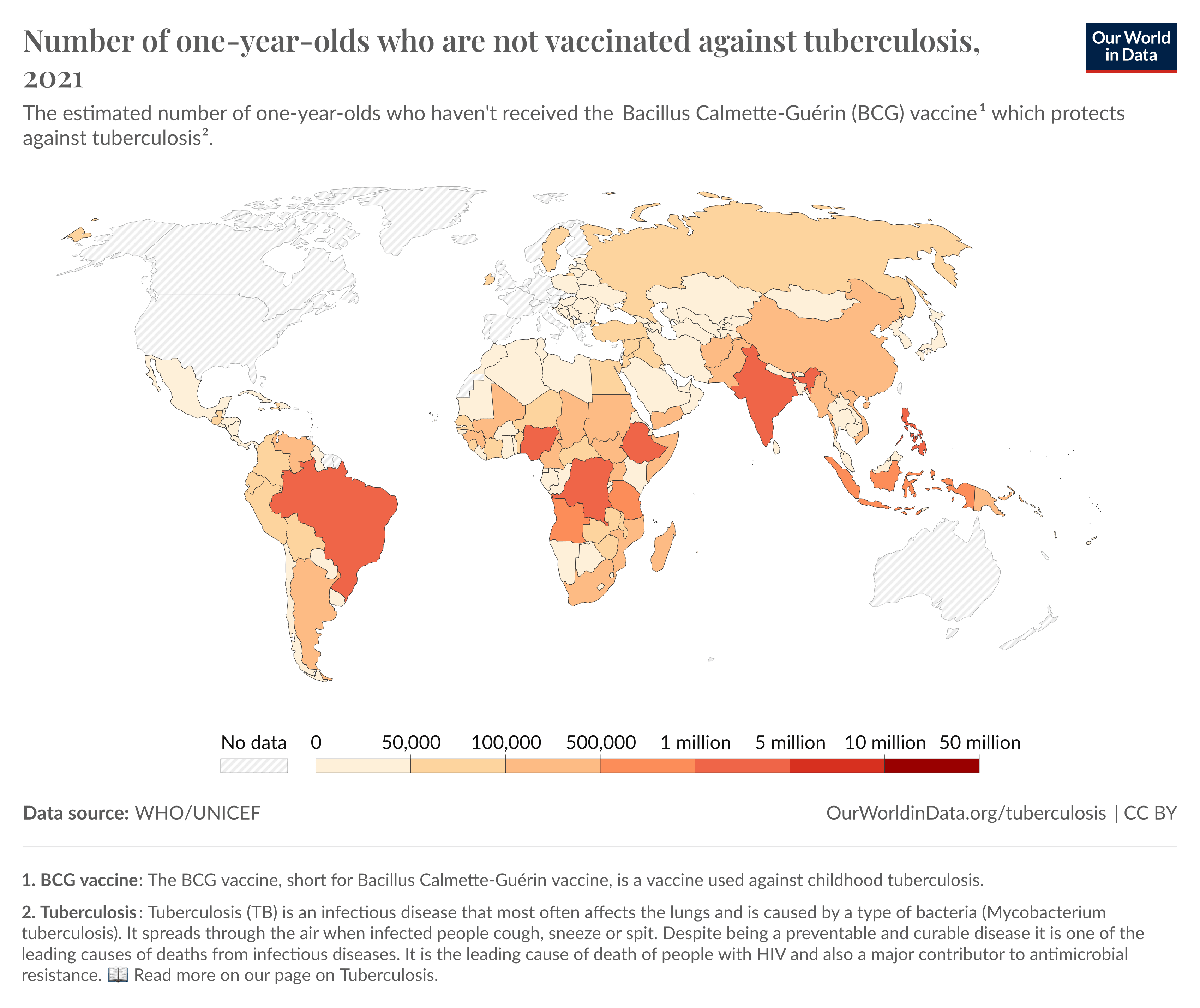 - Data on vaccinations or vaccine provisions are not available for every country, such as French Guinea, Iceland, parts of Sudan, Suriname, and Western Sahara. In some developed countries where TB incidence is low, such as the U.S., BCG vaccination is only recommended for at-risk individuals, such as children of TB patients.