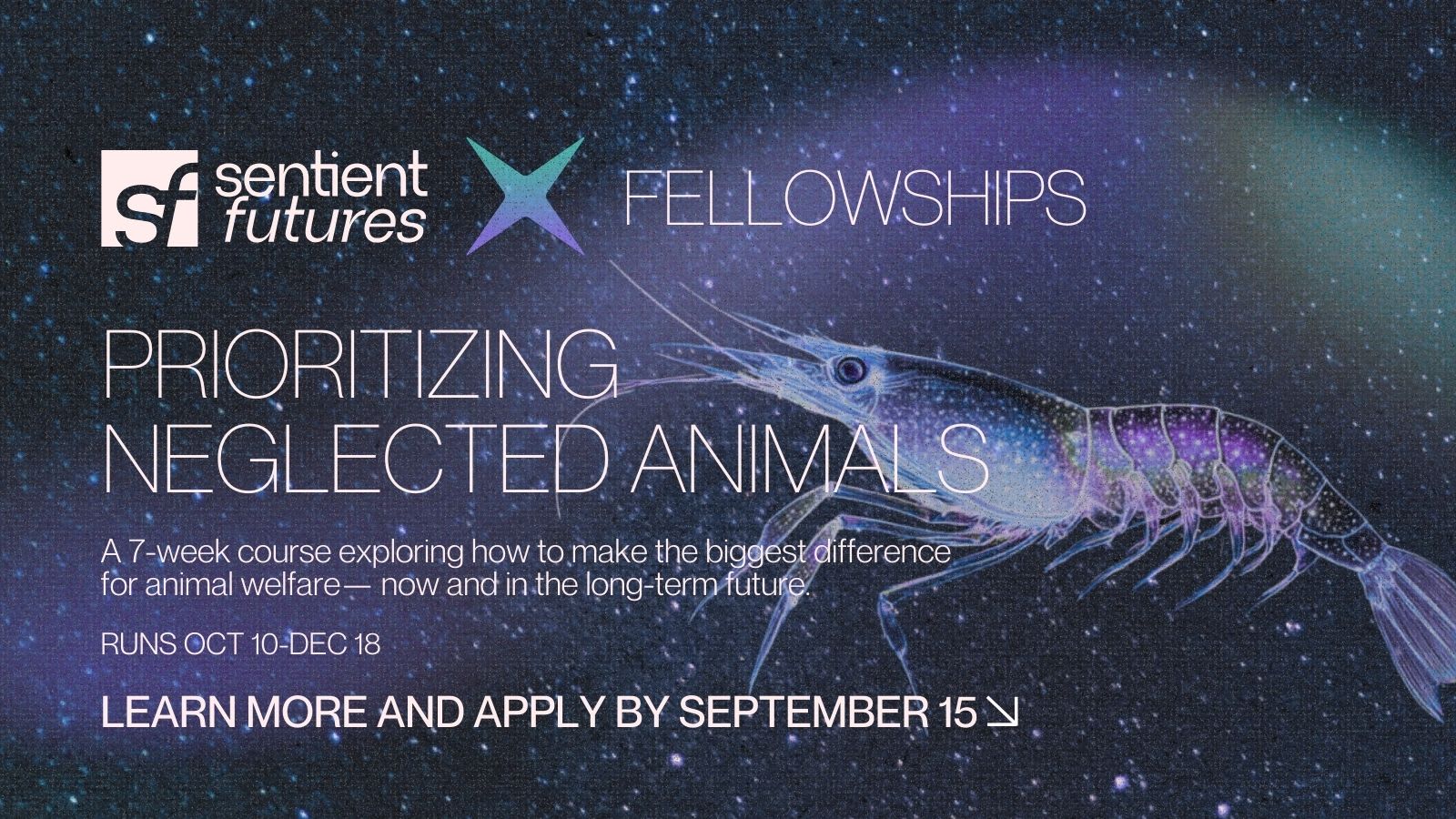 Prioritizing Neglected Animals explores how to make the biggest difference for animal welfare—both now and in the long-term future. Through this 7-week program, fellows will learn key principles for prioritizing interventions across species and contexts using evidence-based tools, including scope-sensitive frameworks, sentience-focused moral weights, and methods for quantifying negative welfare by time and intensity. Fellows will engage in expert-facilitated weekly discussions following our curated curriculum, applying these frameworks to some of the most neglected groups—fish, shrimp, insects, wild animals, and even speculative future animal markets. If this mission sounds exciting to you, we encourage you to apply!