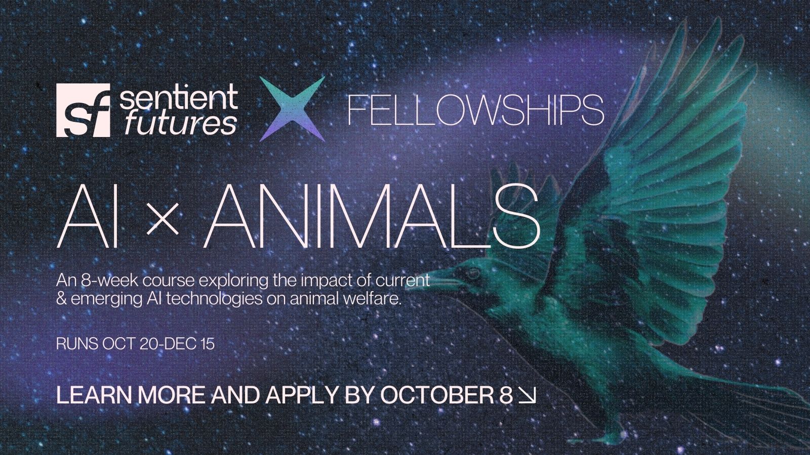 AI×Animals is an 8-week program preparing learners for impactful careers at the intersection of AI and animal welfare. As part of the fellowship, learners will join an industry-leading community working at the forefront of AI and sentient welfare for expert-facilitated weekly discussions following our curated curriculum. If you are excited to ensure the future of AI is positive for all beings, regardless of species, we encourage you to apply!