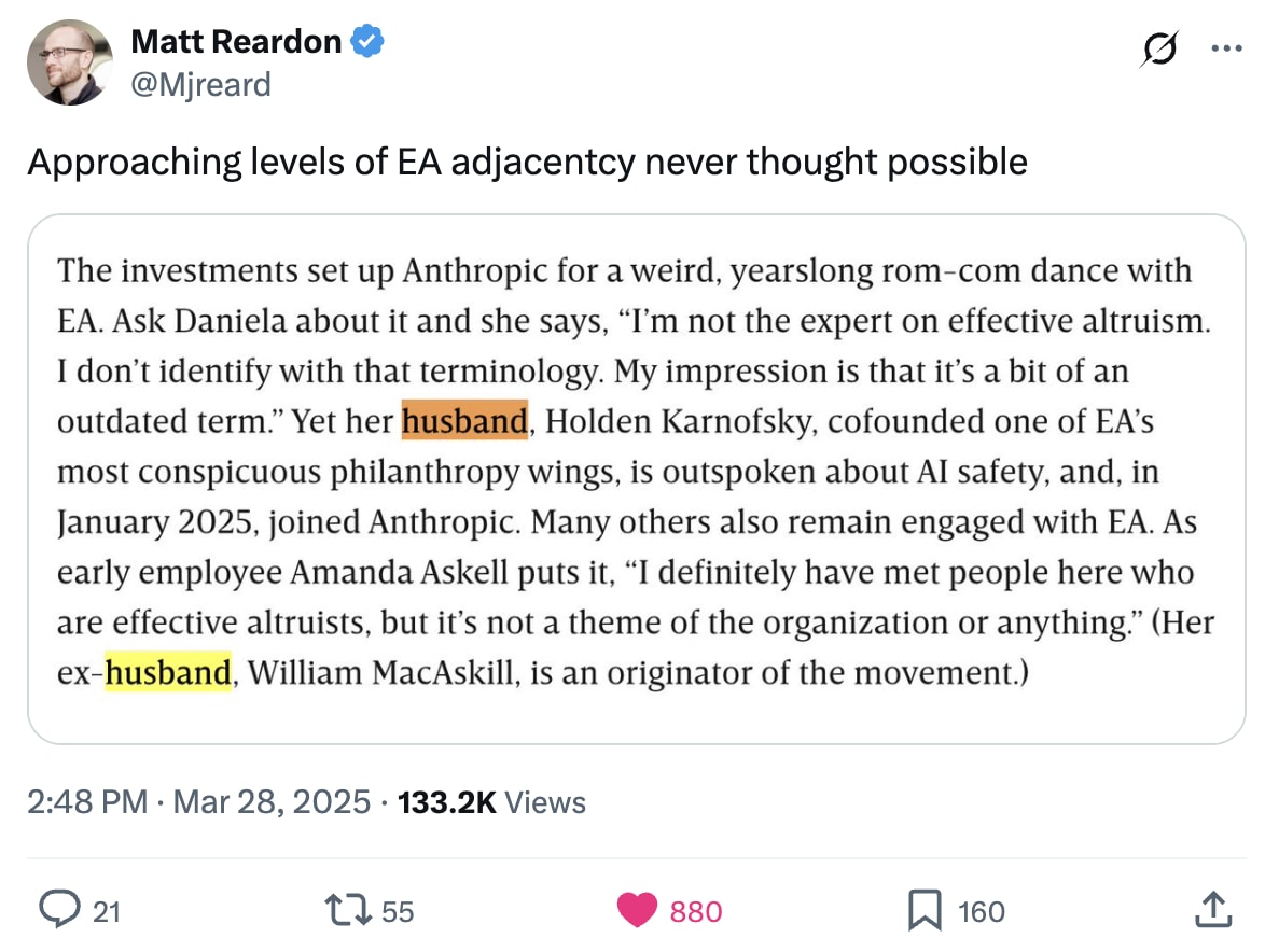 Just as a side point, I do not think Amanda's past relationship with EA can accurately be characterized as much like Jonathan Blow, unless he was far more involved than just being an early GWWC pledge signatory, which I think is unlikely. It's not just that Amanda was, as the article says, once married to Will. She wrote her doctoral thesis on an EA topic, how to deal with infinities in ethics: https://askell.io/files/Askell-PhD-Thesis.pdf Then she went to work in AI for what I think is overwhelmingly likely to be EA reasons (though I admit I don't have any direct evidence to that effect) , given that it was in 2018 before the current excitement about generative AI, and relatively few philosophy PhDs, especially those who could fairly easily have gotten good philosophy jobs, made that transition. She wasn't a public figure back then, but I'd be genuinely shocked to find out she didn't have an at least mildly significant behind the scenes effect through conversation (not just with Will) on the early development of EA ideas.