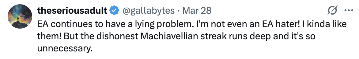 That's not to say I'm particularly optimistic. Just that I'm really not focused on their PR/coms related to EA right now; I'd ideally just keep focused on those two things - meaning I'd encourage them to focus on those, and to the extent that other EAs could apply support/pressure, I'd encourage other EAs to focus on these two.