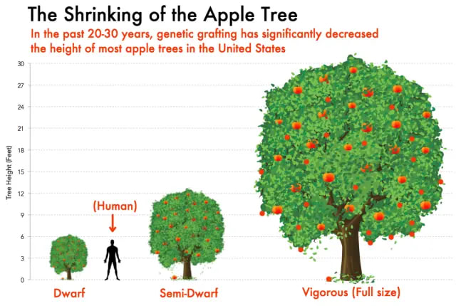 People are already successfully doing this with apples??? In the late 1960s, most apple trees in the USA were 25 to 30 feet tall. But apparently, over the following decades, farmers discovered that “dwarf” trees are actually better: