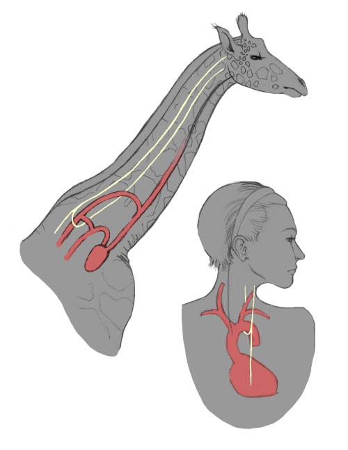 1. The “recurrent laryngeal nerve” connects the brain to the muscles in the throat. But even though the throat is right next to the brain, evolution is too stupid to figure out how to unloop the nerve from where it pointlessly loops around the aorta. So nerve signals have to go ALL the way down to the chest and then all the way back up. This means that giraffes experience crazy lag time of up to a fifth of a second (that’s like 12 frames of lag if you’re playing a 60fps videogame!) whenever they try to swallow anything or make any sound.