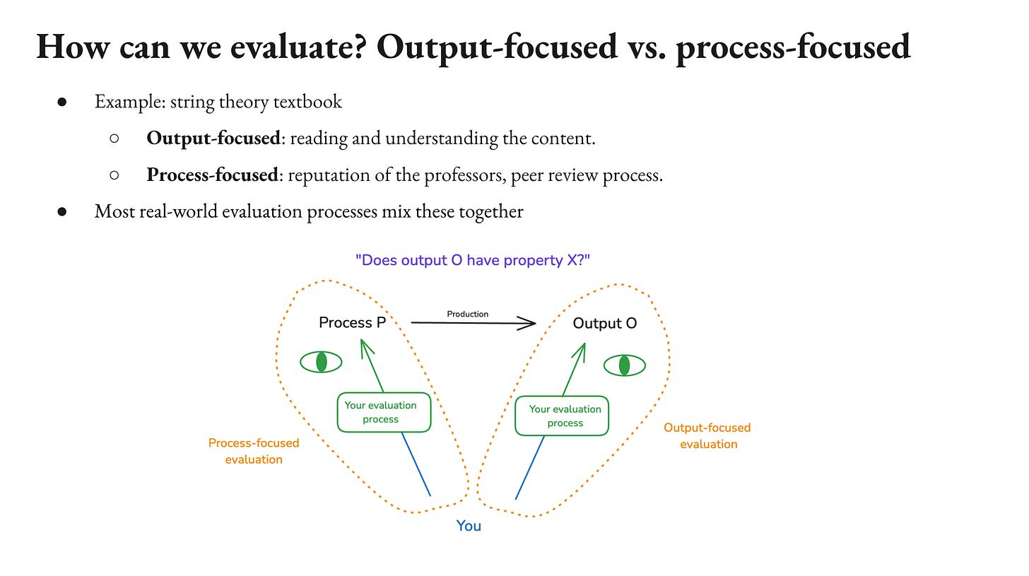 So output-focused evaluation. So you have some process that produces some output, like you have a set of professors and they produce a string theory textbook. And now you want to know is this string theory textbook, correct, up-to-date, reflective of our current understanding, et cetera? One thing you can do is try to read it and understand string theory. Another thing you can do is look at the professors and the reputations and the peer review process, the process that produced it, and most real-world evaluation processes mix these two things together.
