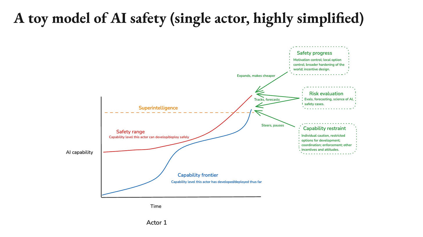 So let's step back just a little bit. This is a little bit of content from earlier in the series to set up why I see this as so important. So here's a very, very toy model of the alignment problem and the AI safety problem. It's just in a single actor, there are zillion simplifications, we can talk about it. But in the rough, rough model, there's a capability frontier. This is the most powerful AI system that a given actor has built. And then there's what I'm calling the safety range, which is the level of capability that you know how to make safe. And very, very roughly the alignment problem is for the capability frontier to stay below the safety range. And then you play that game all the way up to superintelligence. And I'm saying if you get to superintelligence, you solved it, though obviously you can keep going from there.