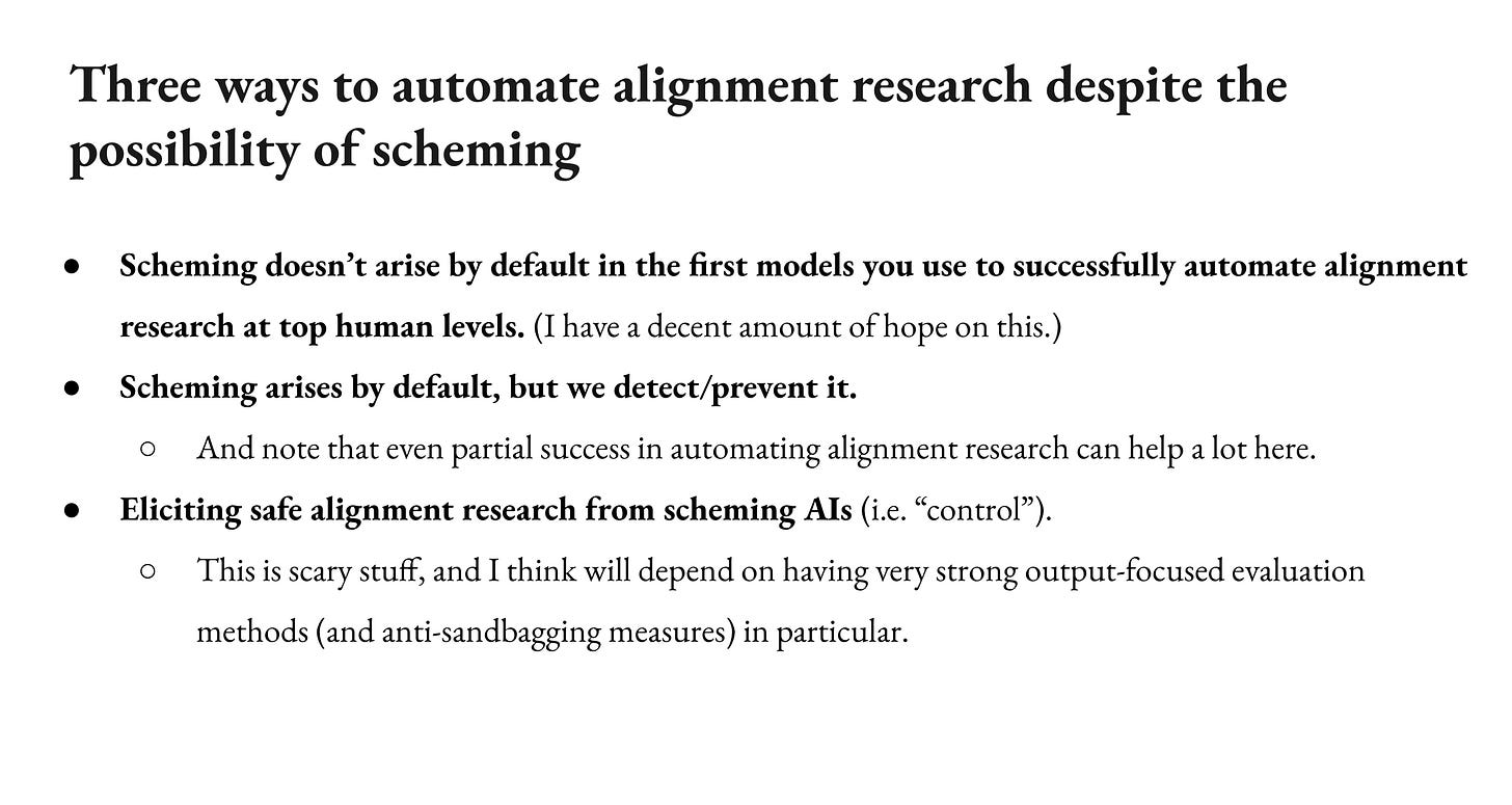 So if you have to deal with the possibility of scheming, how do we automate alignment research despite that possibility?