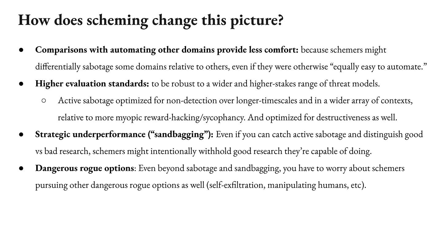 One way is comparisons with other domains provide less comfort because schemers can differentially sabotage some domains relative to others. So if you're just like, "Well, it would be equally hard in capabilities," it might be those schemers are like, "Yeah. But I'm fine. I'm not going to withhold my research or mess with you in the context of capabilities, but I am with alignment." So there's some sense in which the absolute difficulty of automating something becomes no longer the only question because schemers might be making it extra hard in some domains rather than others.