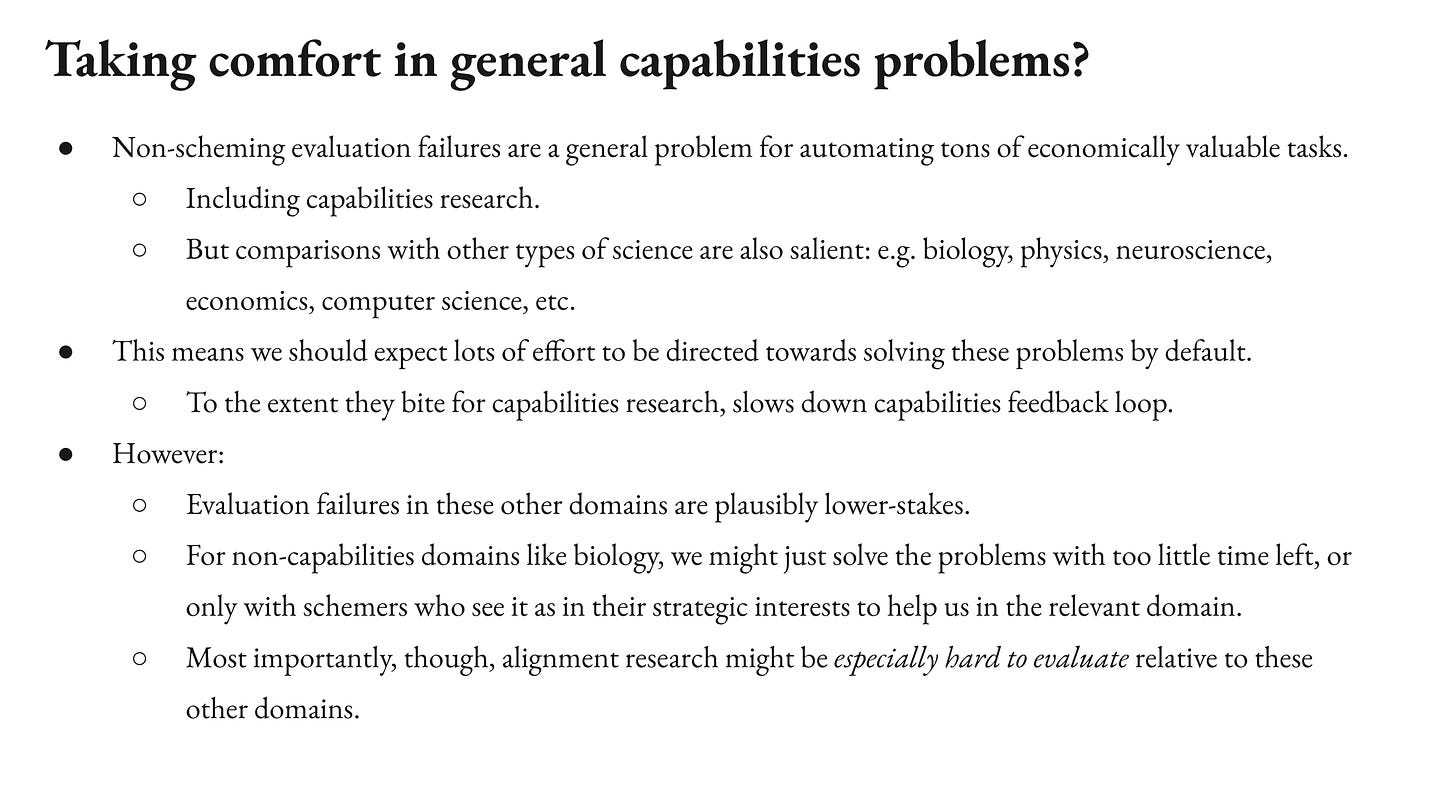 Now, I take some comfort in the fact that this feels a little bit like a general capabilities problem. I think non-scheming evaluation failures, this is just, I think this is a problem potentially for just tons of economically valuable tasks. In principle, it's a problem for capabilities research too. So you can have models reward-hacking, messing with your code, et cetera. In the context of capabilities research, in principle, you can have sycophants convince capabilities researchers of the wrong path to AGI. It's like Yann LeCun's plan is really good and everyone's like, "Yeah. That's great." So these are problems that can come up in lots of places.