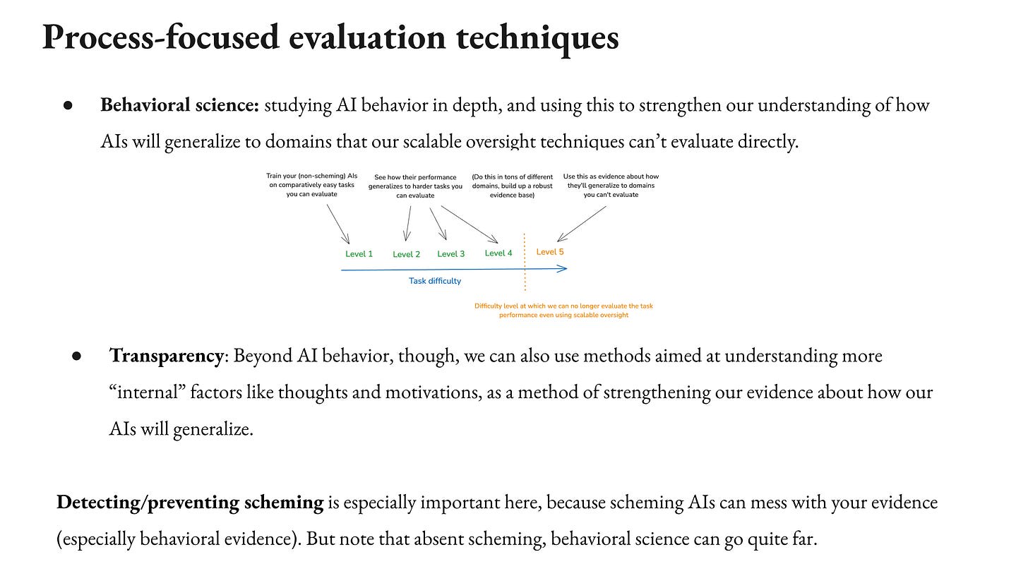 That said, there's also non-behavioral tools, transparency, where basically you look at more internal factors like thoughts and motivations. So interpretability is a classic version of this. I also think chain of thought and using more transparent architectures and scaffolds is another version of this, and this can also help you with your process-focused evaluation. In the limit, for example, if you had interpretability techniques that would allow you to tell that the AI is trying its best to do the task in the way you want, then that would help you a lot in your process-focused evaluation. And in some sense, you can think of the aspiration of a solved alignment problem is like you've gotten really good at process-focused evaluations, so you're trusting the AI going forward.