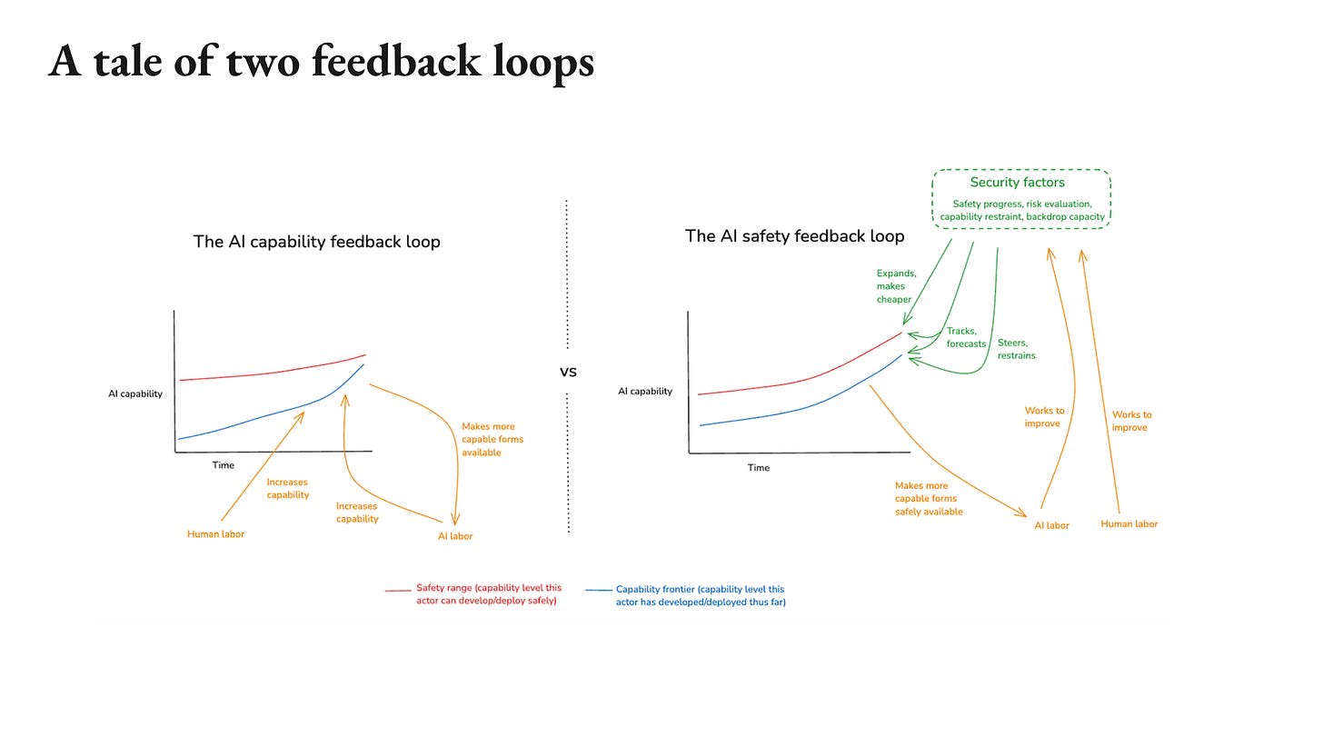 That said, there's another feedback loop that might be able to help, namely what I'm calling the AI safety feedback loop, wherein increasingly potent AI systems are also able to help more and more with the factors that help keep us safe. So alignment research is a very key one there, but there are also others there. There's our evaluation of the risk, there's our coordination and epistemology, our governance mechanisms, all sorts of things. AIs can help make our civilization more competent at handling this problem. So very, very roughly the challenges I see it is to do enough of this such that the AI safety feedback loop either outpaces, or restrains the AI capability feedback loop at all stages. So you're either increasing the safety range fast enough or you're slowing down the capability frontier such that you don't proceed until it's safe.