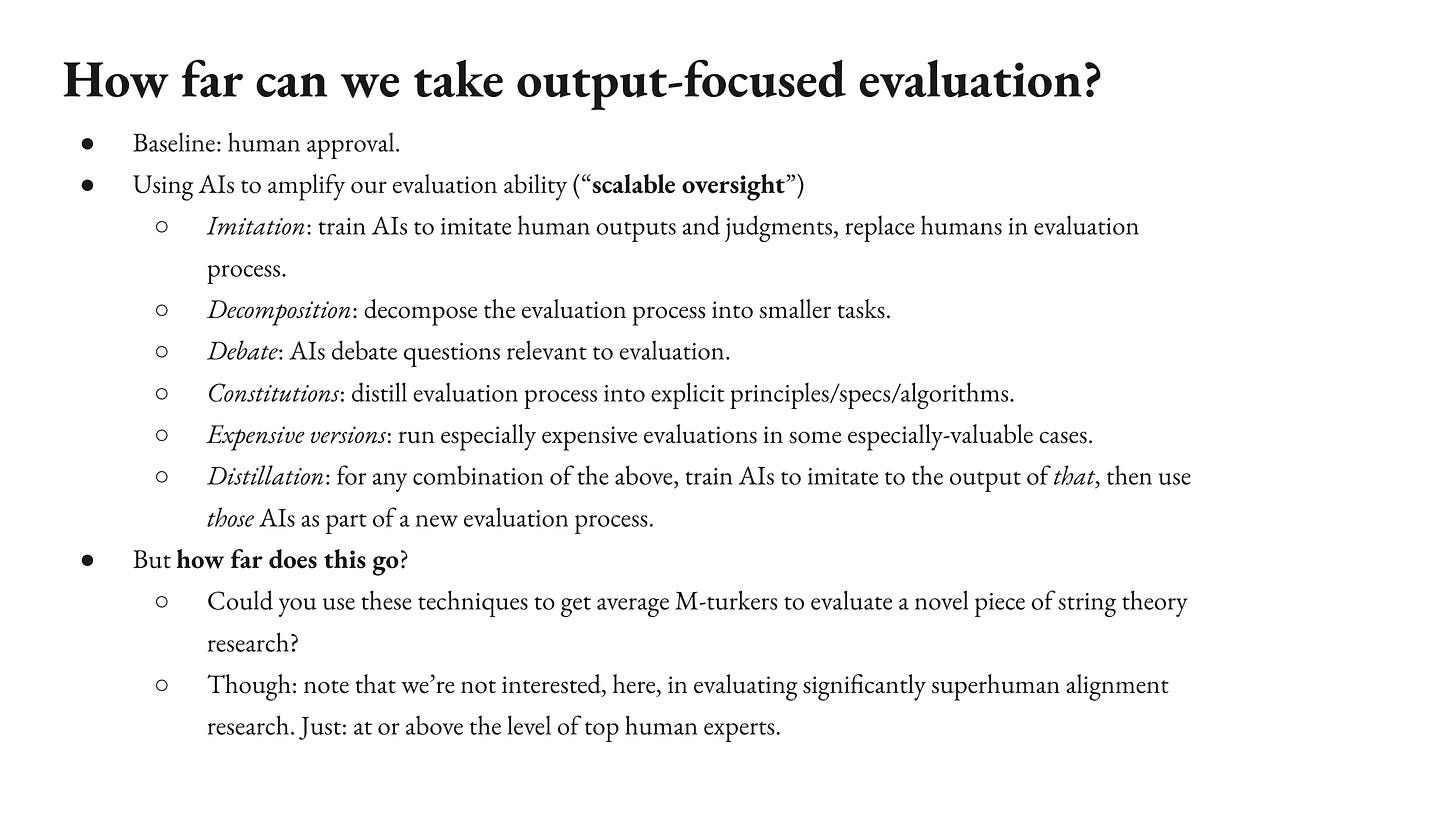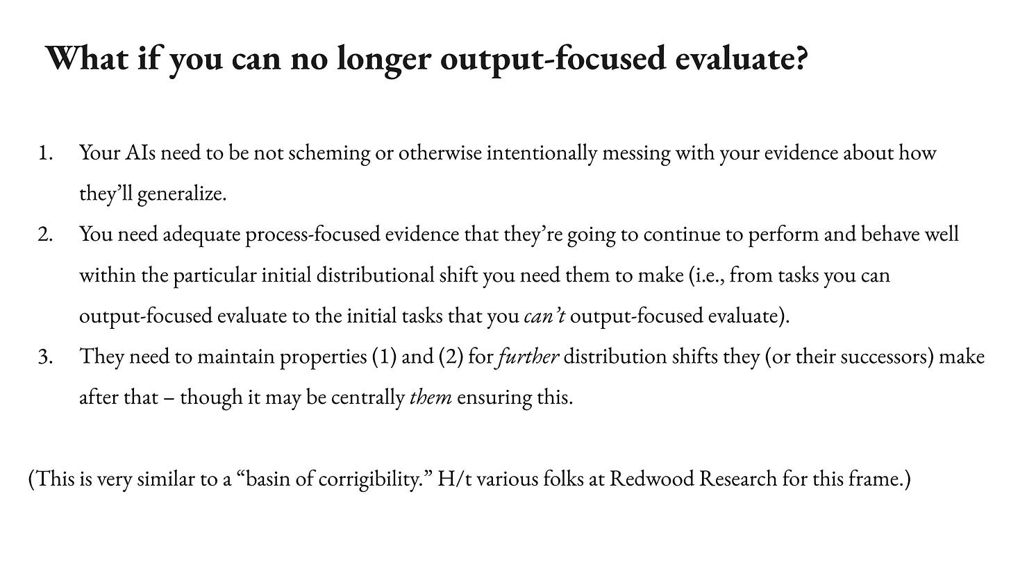 I'll just say quickly. So there could come a point where you can no longer output focus evaluate. I think this is closely related to the point where you're doing some handoff and there's a few conditions we can talk about there. As I say, I think at that point you don't want to hand off to schemers. You need the AI to not be scheming. You need to have done a bunch of process focused stuff. You need great evidence about how they're going to generalize initially outside of the distribution where you've tested, where you're confident about how they'll behave, and then you need them to maintain their good behavior for further distributional shifts after that. This is a broader topic. I'm going to do some work on this in future, but I thought just flag it. There's this important question of what happens if your output focused evaluation ability runs out and what are the criteria you need at that point to trust your AIs?