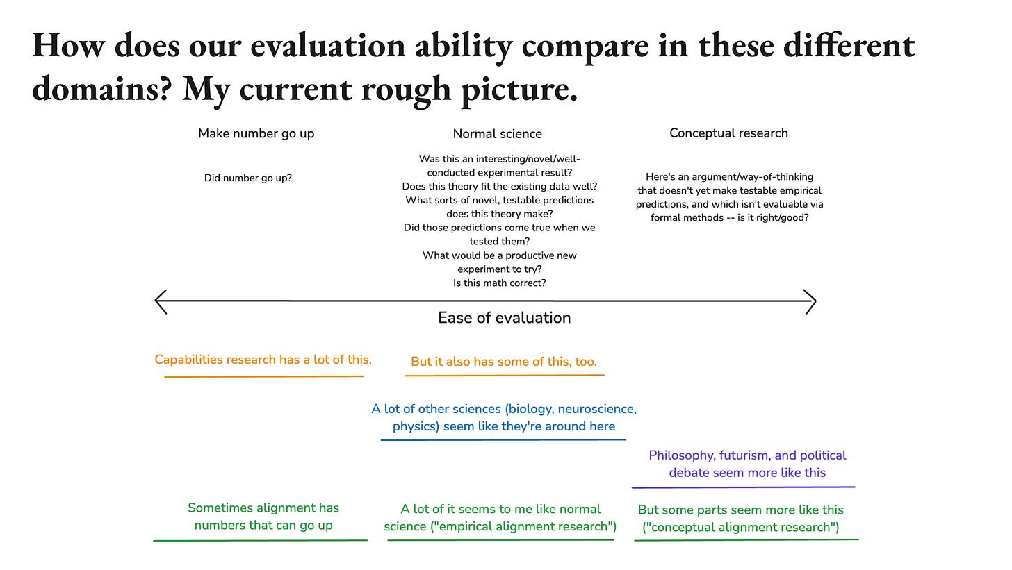 So the first version I'm calling make number go up. There the key evaluation question is: did number go up? So that's an especially easy type of evaluation. You look at number, you see: up or not. Capabilities research famously has a lot of this, and alignment sometimes has this too. And sometimes people think that this is just all the capabilities is. This is an incredibly dumb process of just like there's a number, then the number goes up or not gradient descent, et cetera. But you guys would know better than me what all is involved.
