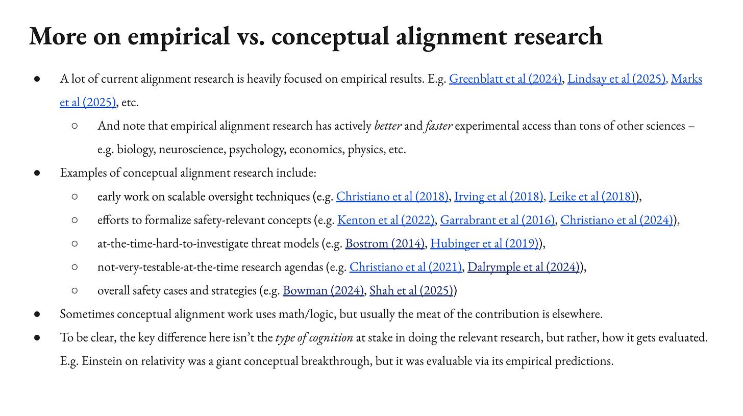 So I'm going to assume we need both of these. When you talk to people, some people like this, empirical research is the only thing that matters. And some people are like, conceptual research is the only thing that matters. I'm going to try to get both. I'm going to assume that we're going to need both along the path. Human researchers do both. But I think empirical alignment research may be easier to evaluate, as I said and I think that's important. It still might be harder than number go up, but easier than conceptual.