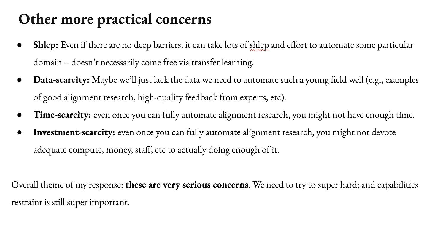 So I was focusing here on fundamental concerns. There's also these practical concerns I flagged earlier, like I said, schlep, data scarcity, you might not have enough time, you might not invest enough. I'm treating these like they're less of a big deal because they're a less fundamental barrier. But I think they might just be a lot of the meat of the problem that just like doing the work, having the time actually putting in the effort to do enough alignment research, I think could be a huge amount of the game here. And I think it's not at all obvious that it will work, but I think it's worth trying very hard.