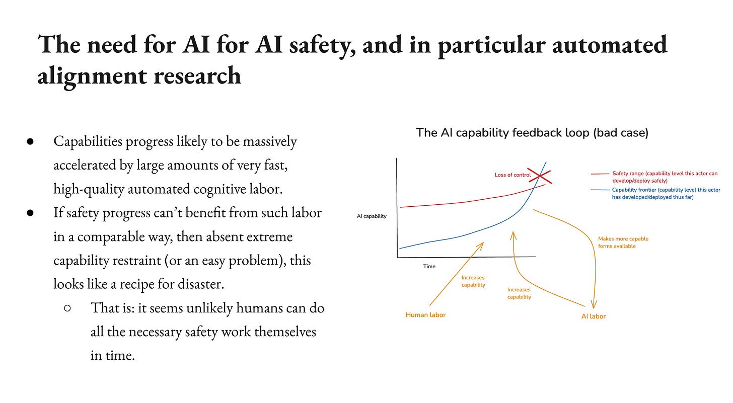 So that's the broad dynamic I'm interested in and in that context, I think it becomes especially clear why automated alignment research is such a key factor. So basically if you imagine a context where the capability loop is kicking off hard. And capability progress is being massively accelerated by large amounts of very fast, high quality automated labor. If you imagine that you can't use AI labor on safety either, then you've got this tough dynamic. You have all these zillions of really, really smart AIs pushing forward capabilities or at least being able to do that and meanwhile, your bottlenecked on the safety range by the slow human.