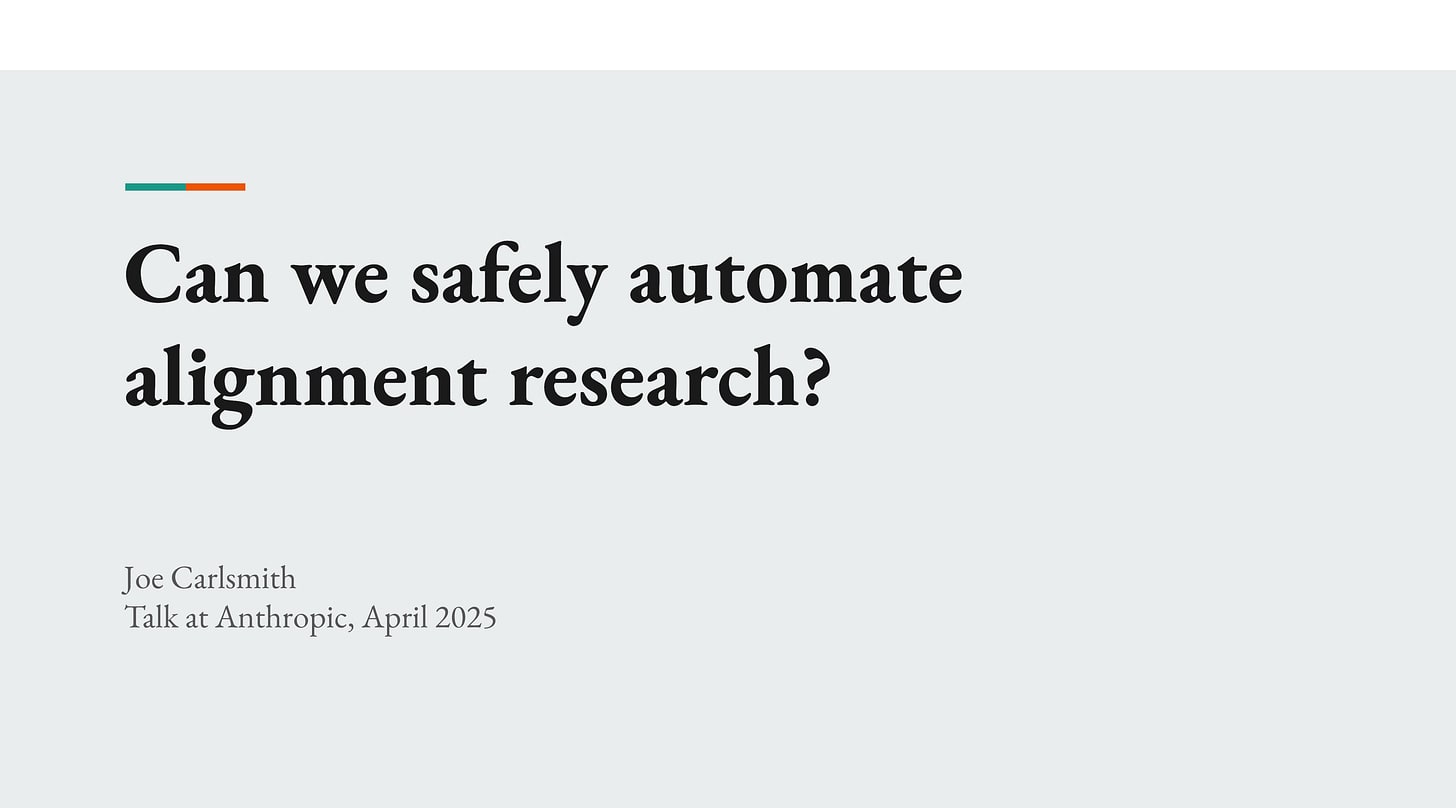 This is the video and transcript of a talk I gave at Anthropic in April 2025 on automating alignment research. You can also view the slides here.