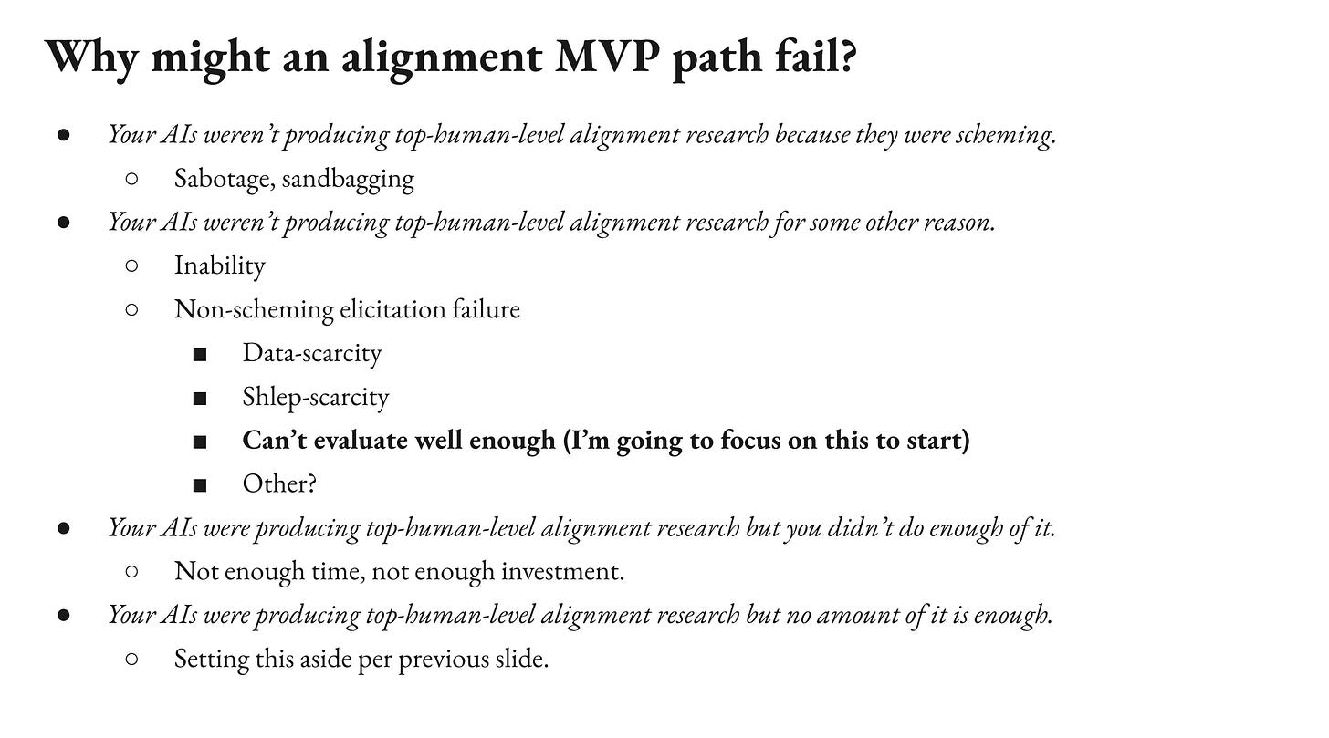 These are more practical barriers. I want to focus on what seems like a potentially more fundamental barrier, which is if you can't evaluate alignment research well enough, then maybe that's a more fundamental way in which you can't automate it at top human levels. So I'm going to go into that in some detail. I'm also interested, are there others that aren't not on my list that you guys would want to flag? I'd be curious.