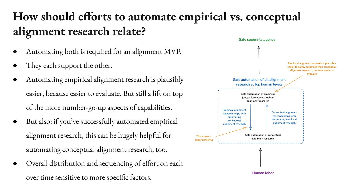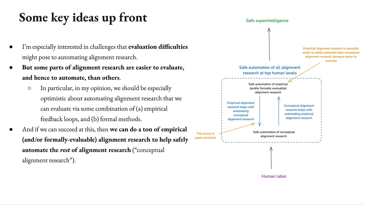 In particular, I think we should be especially optimistic about automating alignment research that we can evaluate via some combination of empirical feedback loops and formal methods. I'm especially interested in empirical feedback loops here. And then on top of that, I think that type of alignment research can be really useful for automating the rest of alignment research, what I'm going to call it conceptual alignment research. So there's a one-two punch here where there's one version is easier, but that's really helpful for the rest. So I'm hoping that that dynamic can be useful to have in mind.