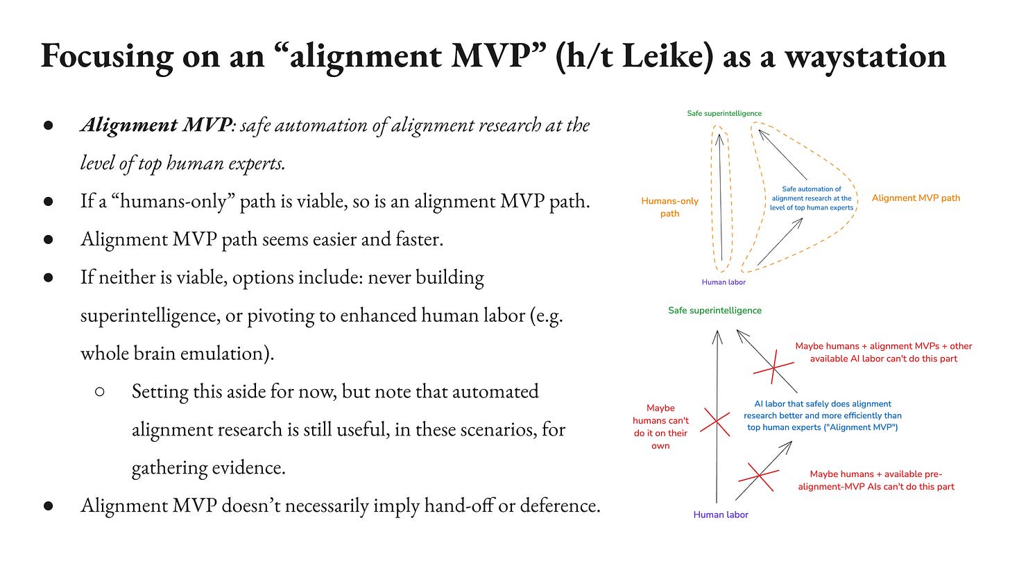 So in that context, I'm going to focus on a intermediate milestone inspired by Jan Leike of Anthropic, which I'm calling an alignment MVP. There's different specifics we could focus on here. I'm going to focus on the safe automation of alignment research at the level of top human experts. So this doesn't need to be a super intelligence doing alignment research, we just want to replace top human experts. We could maybe go a little bit above that and say at least decently better than human experts or more efficient. I'm going to assume if you get this, you also get it more efficiently because you run the AIs fast, but we're trying to have human parity or better.