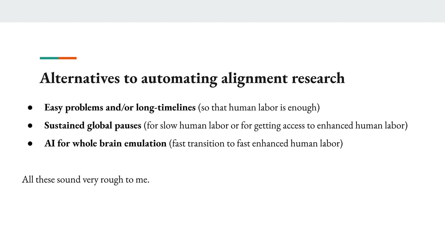 And then maybe I'll just say very briefly, suppose you've got really pessimistic about all of this. What are the alternatives to automating alignment research? I'm finally going to talk a little bit more about this later in the series.