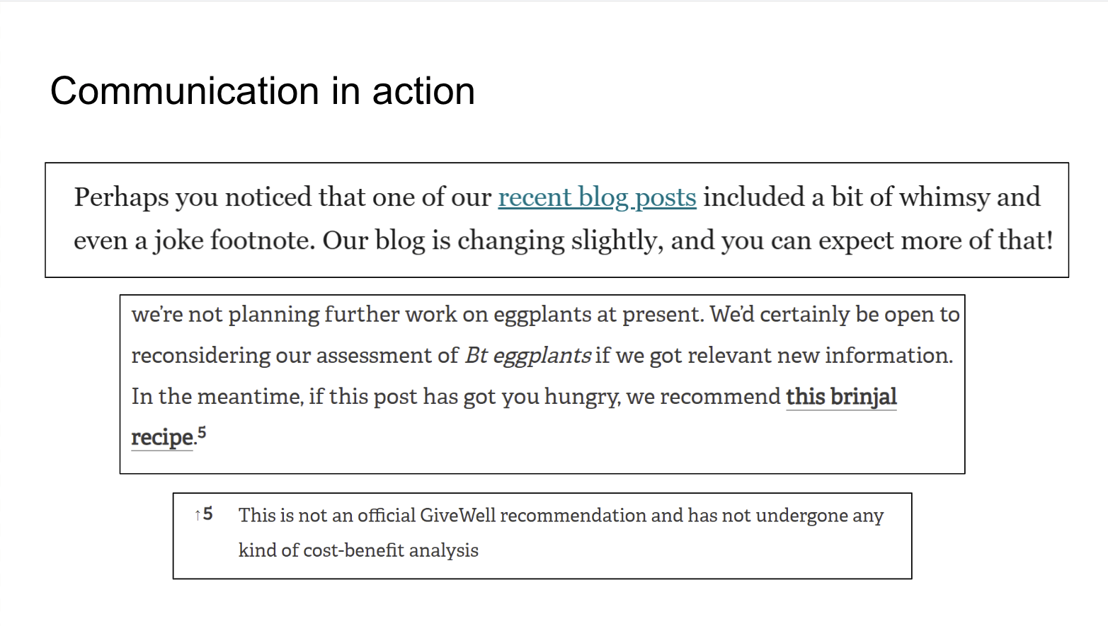 As an example, GiveWell recently sent out an email celebrating their change to a more accessible blogging style. In that email, they took particular pride in mentioning how they managed to include a joke footnote in a recent post. The joke they went out of their way to email their followers about, of course, includes a reference to cost benefit analysis. GiveWell, I love you, and I hope you always find joy in your footnotes.
