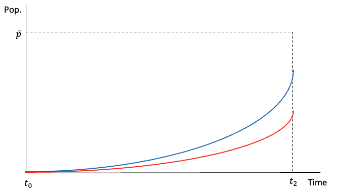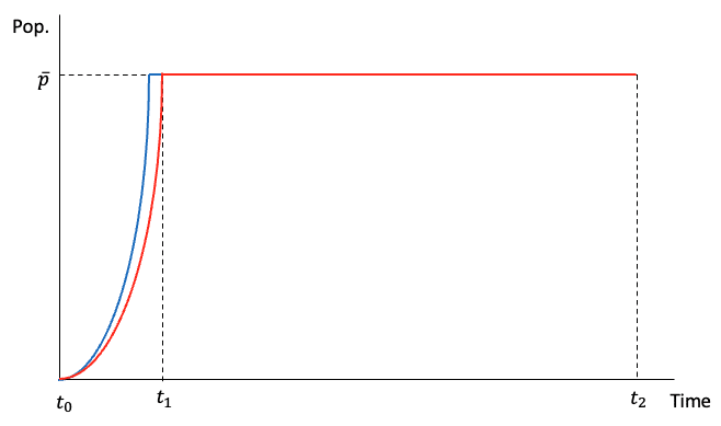 Perhaps the condition above does not hold, and perhaps the universe will become inhabitable to humans before we ever reach a steady state (), as illustrated below. In this case, increasing population growth could have massive effects on population size.