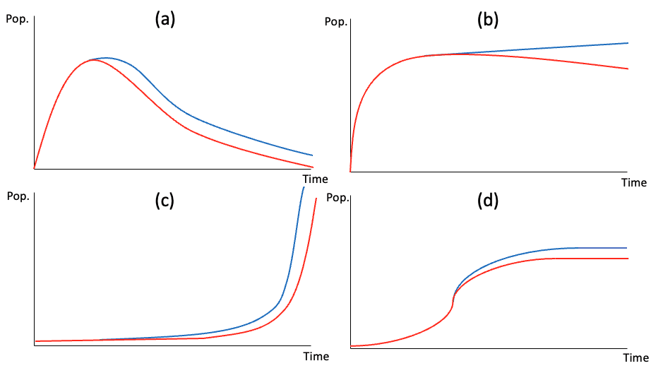There are a few different ways in which these long-run population increases could take place, and the graphs below illustrate some of these possibilities. In each case, the red line denotes the business-as-usual scenario, and the blue line denotes a possible population trajectory after an intervention. In scenarios (a) and (b), population eventually declines to zero without intervention, as an extrapolation of the UN projection would suggest.[8] An intervention in these cases could either slow down the decline or change the long-run trajectory from a decline to an increase. Alternatively, long-run population may not decline without bound without intervention, as it could increase without bound (scenario c) or stabilise (scenario d). Population interventions could hence increase the long-run rate of growth or increase the level at which it will stabilise.