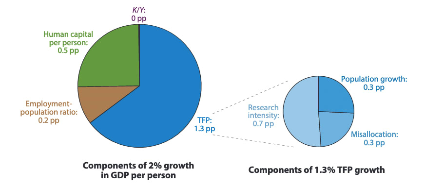- Total factor productivity growth (roughly, technological improvements and misallocation reductions[22]) account for 1.3 p.p.