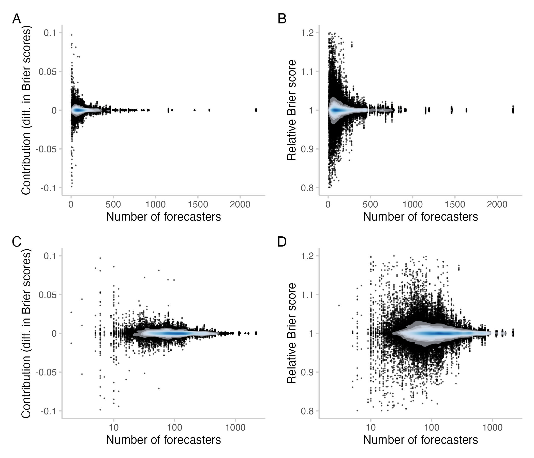 Figure 3: Contributions / relative Brier scores for different numbers of forecasters who contributed to a question. Each point represents one individual contribution by a user. Bottom row: Same as top row, but with the x-axis on a logarithmic scale. The shade overlayed shows the density of observations- blue means there are a lot of observations, white means there are not so many observations.