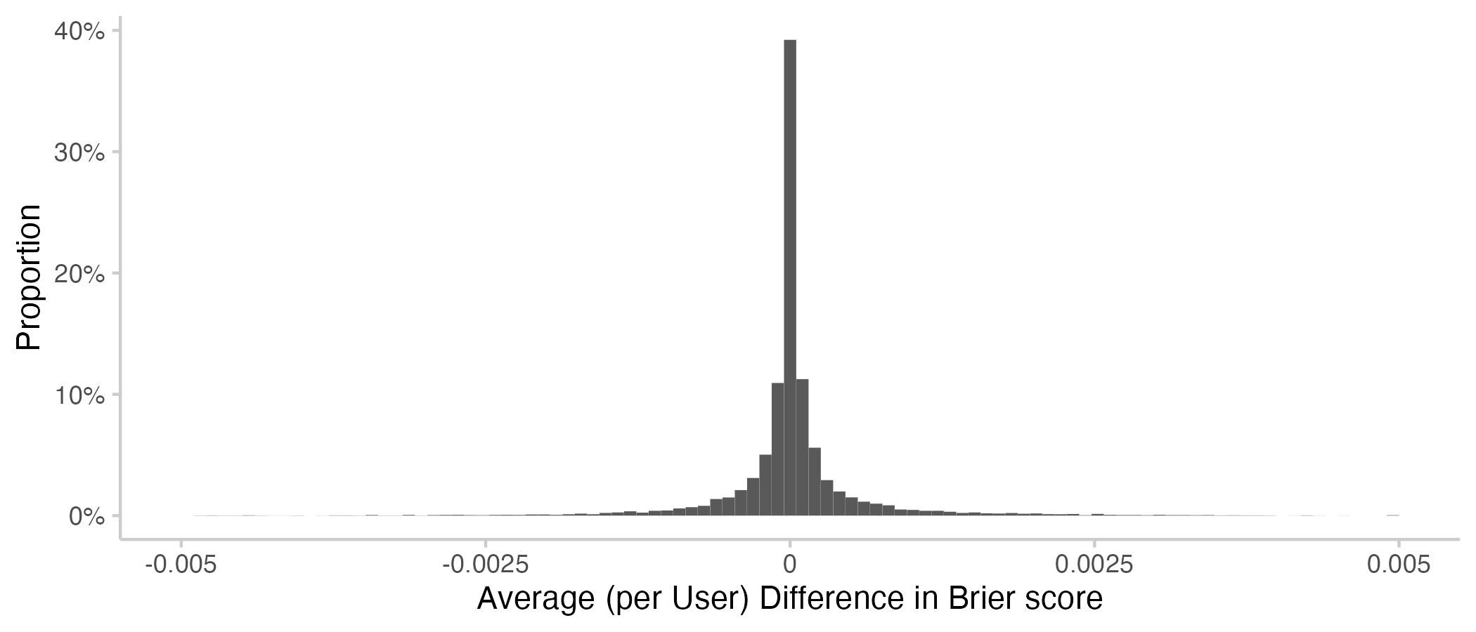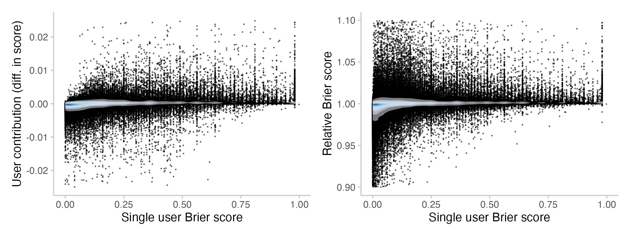 The following plot shows how Brier scores changed due to the contribution of a user. Negative values (for differences) or values smaller 1 (for the relative score) means that the Brier score has improved due to the contribution made by a particular user.