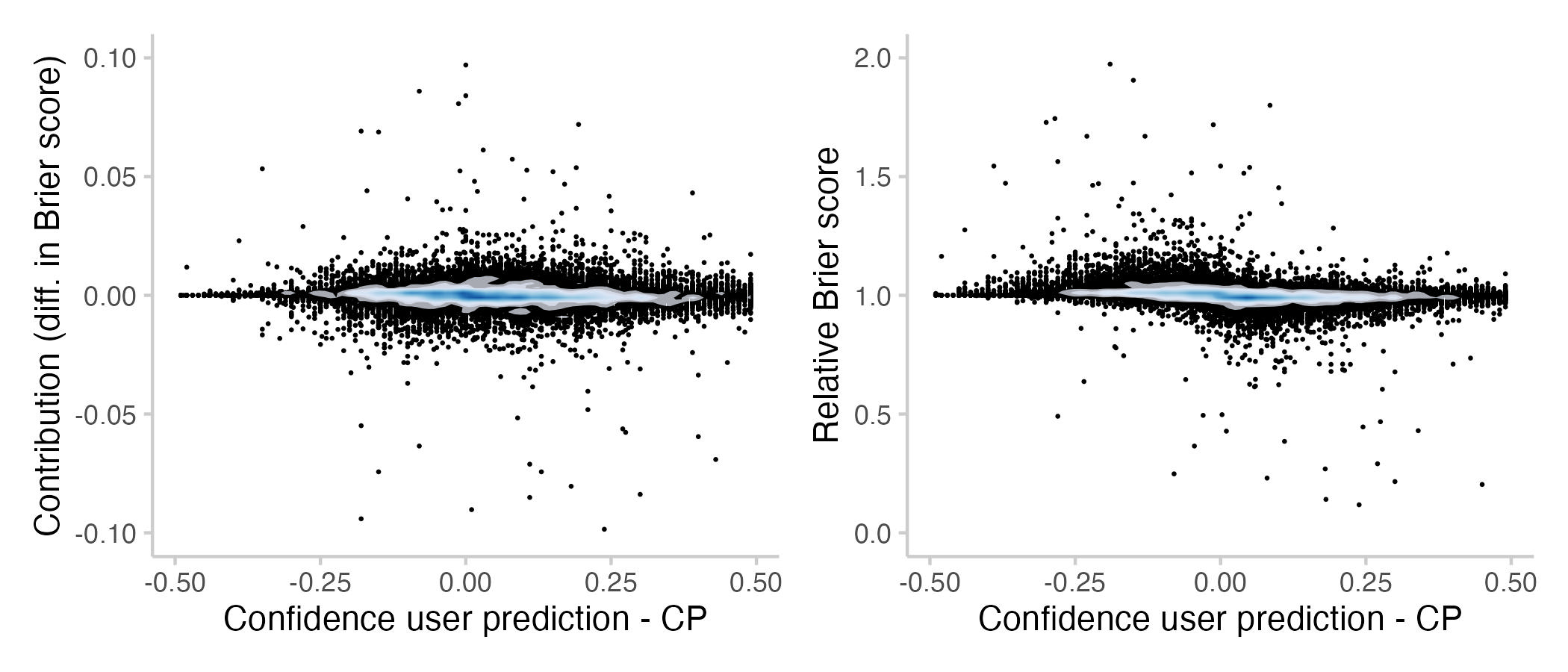 Figure 6: Contributions to the CP from individual forecasts and Brier scores associated with that forecast. Every point represents the contribution / score from the forecast (+ updates) of a single user on a single question. The shade overlayed shows the density of observations- blue means there are a lot of observations, white means there are not so many observations.