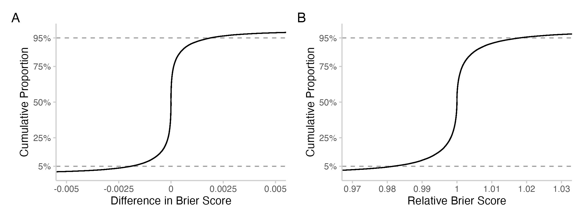 Figure 2: Cumulative proportion of the absolute or relative changes in Brier score. The curve essentially says: what percentage (number on the y-axis) of all observed values are smaller than x (number on the x-axis).