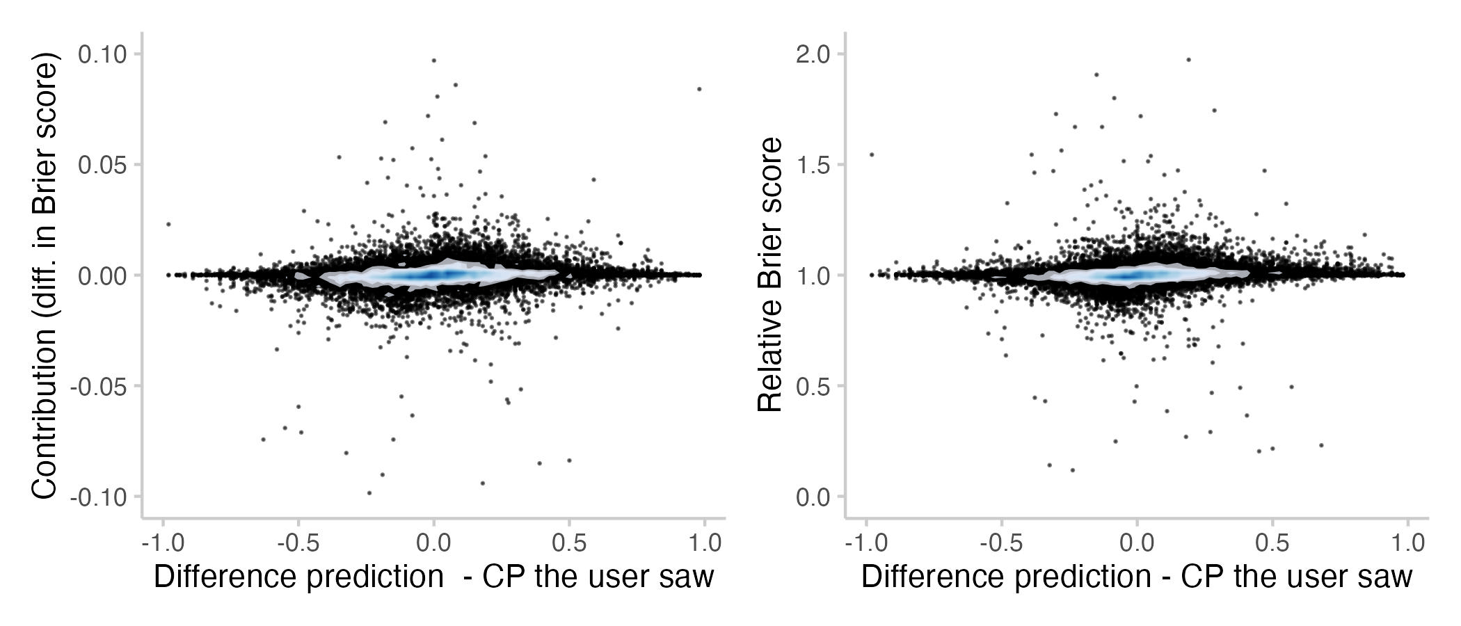Figure 8: Contributions and relative Brier scores vs. the difference between prediction and CP the user saw (If a user updated multiple times, then that's the average distance). Every point represents a single forecast. The shade overlayed shows the density of observations- blue means there are a lot of observations, white means there are not so many observations.